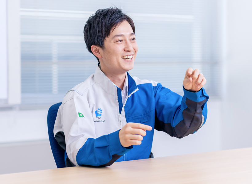 私は、幼いころから図工などのものづくりに興味があり、名古屋出身ということで名古屋のものづくりメーカーへの就職を志望していました。機械電気採用枠で親会社の日本ガイシに入社し、電気設計として1年半従事した後に、現在は出向という形でNGKキルンテックに勤務しています。